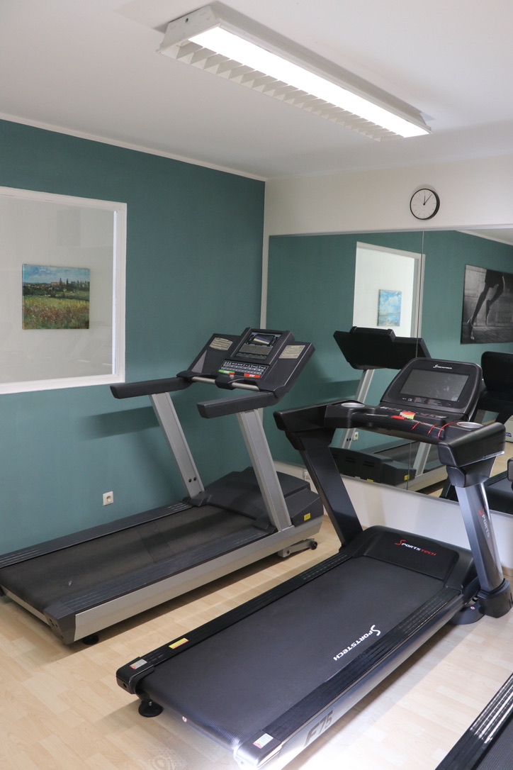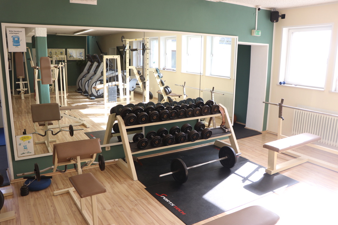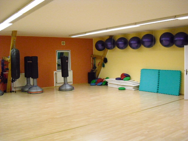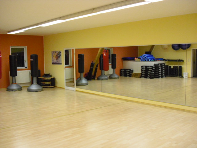Gelenkschonender Sportboden mit rutschfestem Laminat, große Spiegelwand, Steps, Tubes, Pezzibälle, Hanteln kurz und lang, Standsäcke, usw.