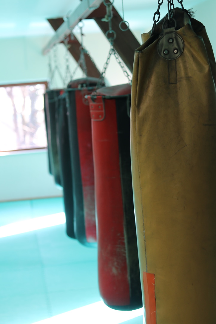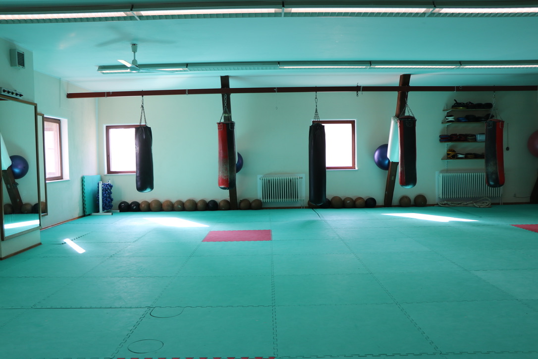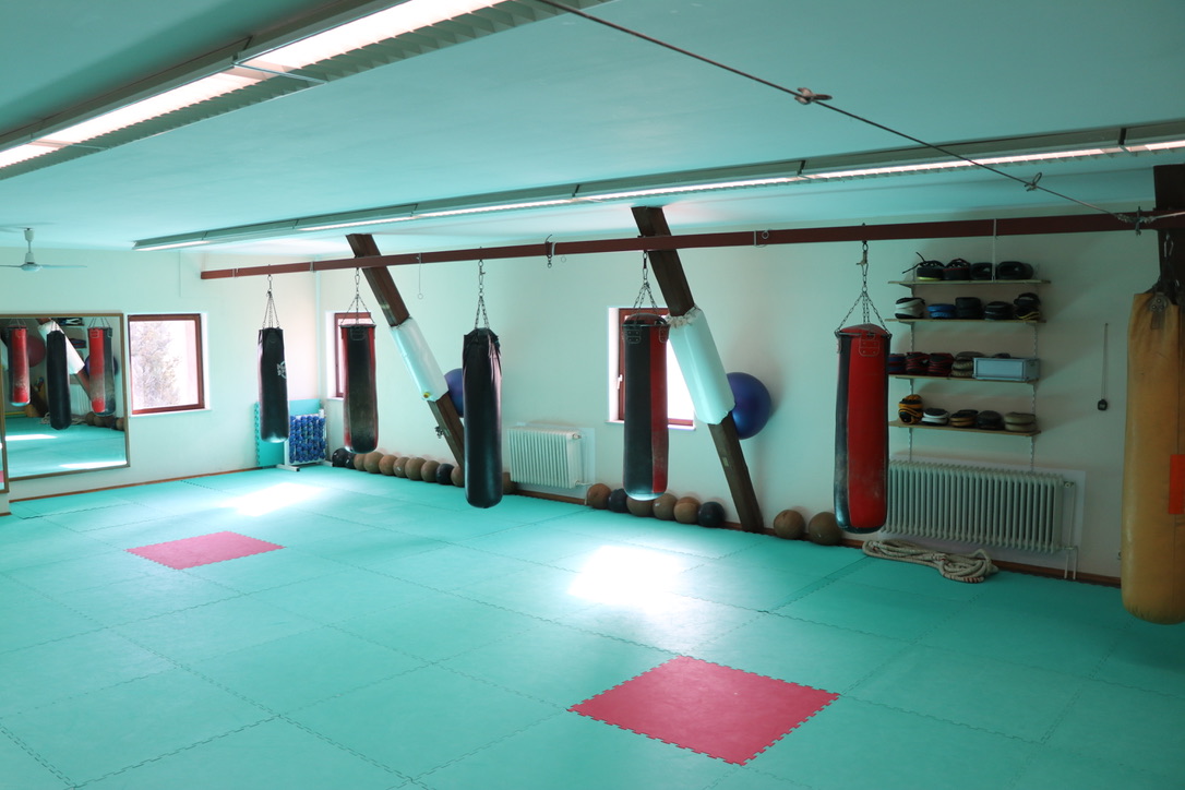 Gelenkschonender Holzschwingboden (Sportboden), Spiegelwände, Boxpuppen, Medizinbälle, Schlagpratzen, usw.